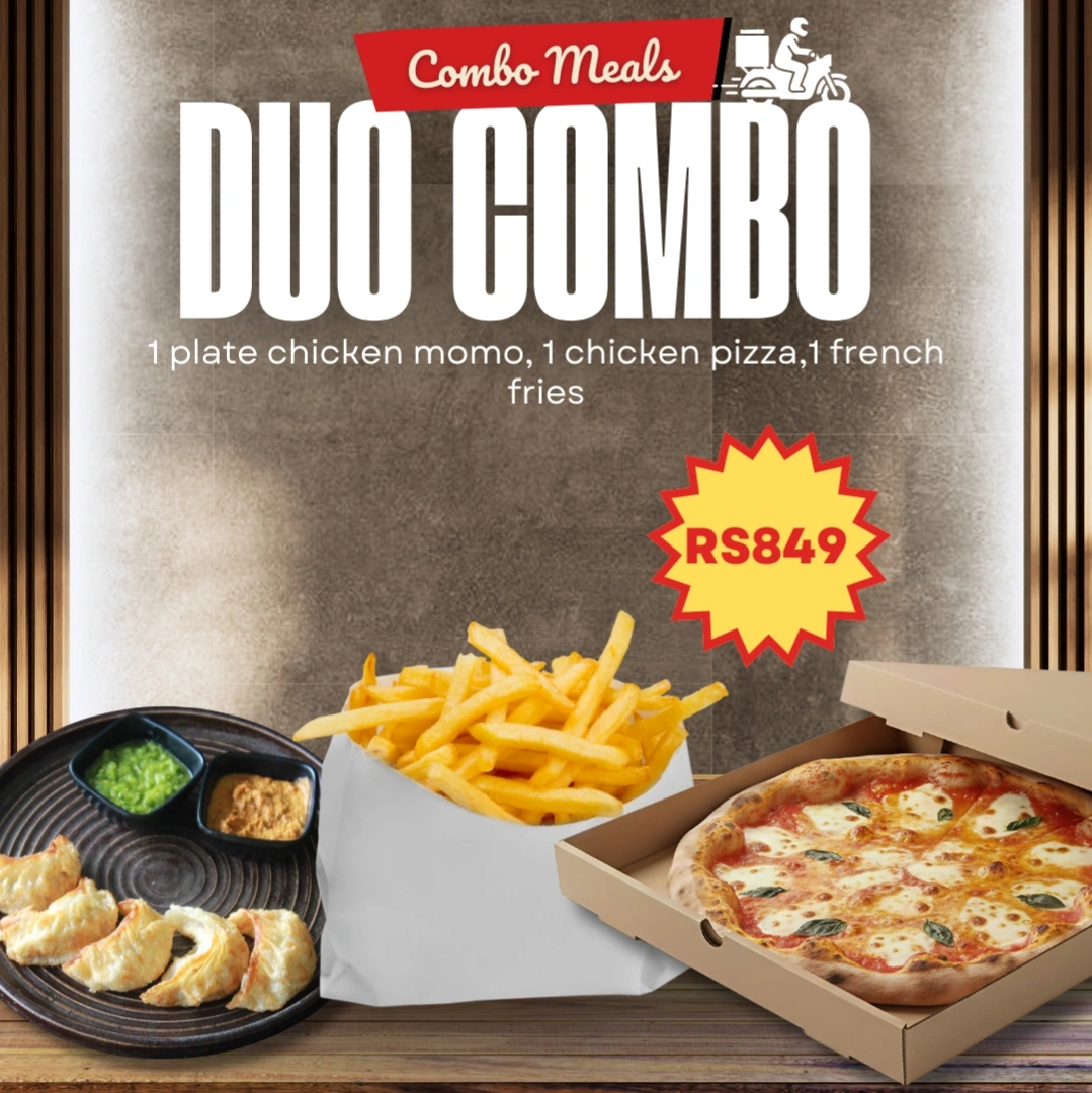 The Duo Combo combines Nepal’s favorite chicken momo with a freshly baked chicken pizza and crispy golden fries. It’s the perfect mix of local and classic flavors in one complete meal.