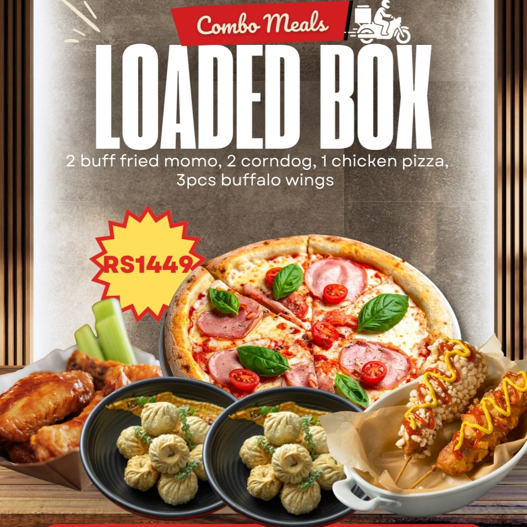 The Loaded Box is packed with variety and bold flavors. It includes crispy buff fried momo, delicious corn dogs, a freshly baked chicken pizza, and three pieces of buffalo wings.